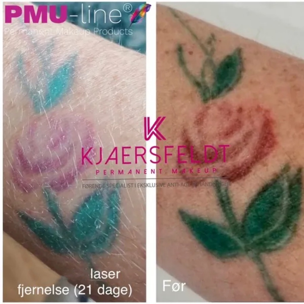 - Behandlinger kan udføres med 6 ugers mellemrum på permanent makeup og tatovering (vi anbefaler at behandle område, der ikke er større end 10×5 cm af gangen)